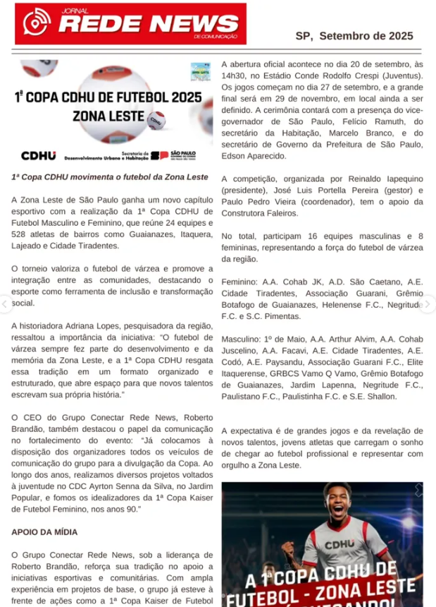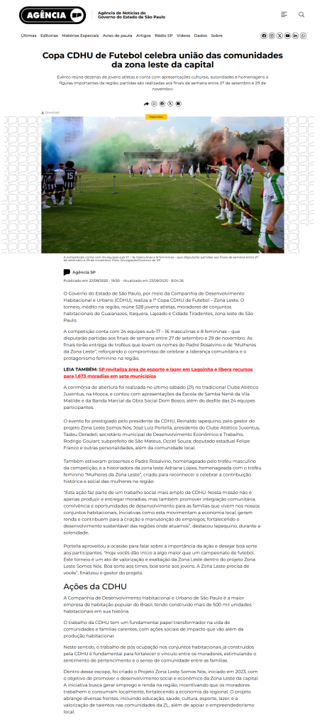 O jornal Rede News publicou matéria em suas redes sociais sobre o início da 1ª Copa CDHU de Futebol – Zona Leste, com informações completas sobre o torneio. Leia na íntegra em: https://www.instagram.com/p/DOs-H_MEUPP/