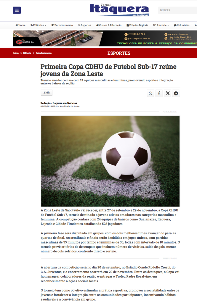 O jornal Itaquera em Notícias publicou nota sobre o início da 1ª Copa CDHU de Futebol – Zona Leste, com informações completas sobre o torneio. Leia na íntegra em: https://itaqueraemnoticias.com.br/noticia/152317/primeira-copa-cdhu-de-futebol-sub17-reune-jovens-zona-leste
